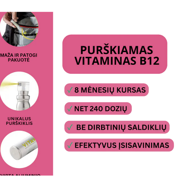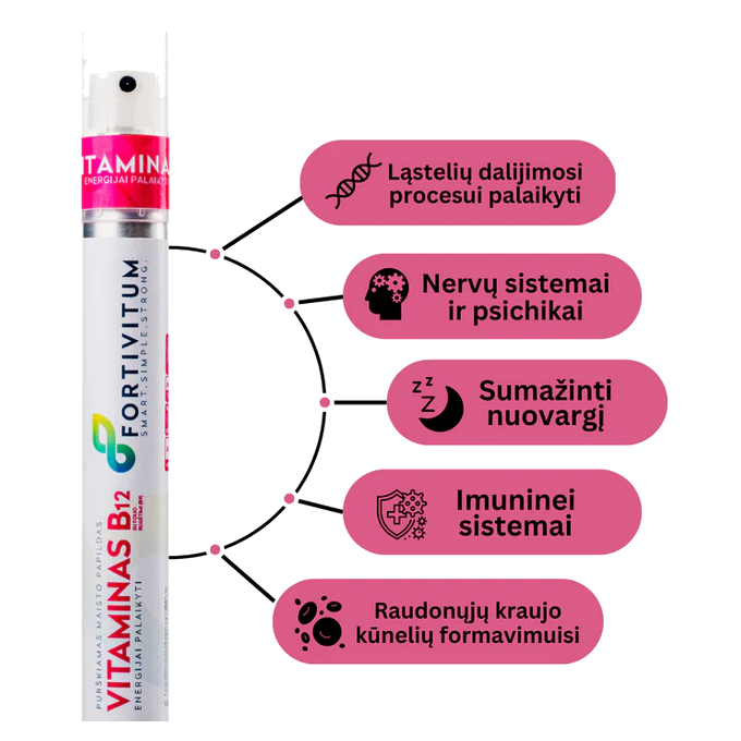 Fortivitum® Vitaminas B12 + Folio rūgštis tinka tiems, kurie daug dirba ar mokosi. Taip pat esant B12 trūkumui. Purškiami vitaminai veikia iš karto ir yra puikaus skonio. Tinka vegetarams ir veganams.