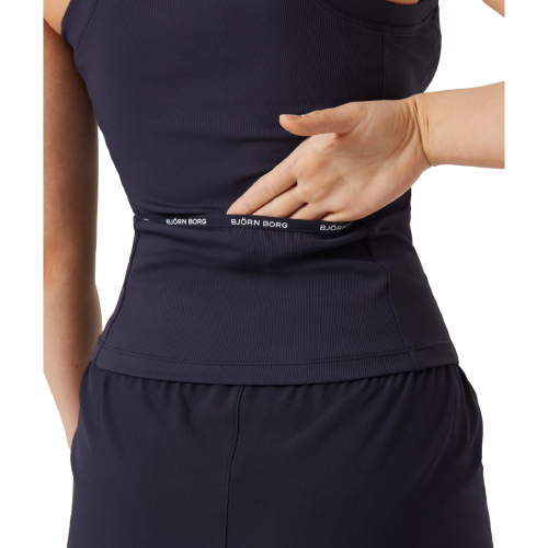 „Björn Borg Ace Rib Tank Pocket“ tai stilingas briaunuotas treniruočių trikotažas moterims, pagamintas iš perdirbto poliamido elastingo minkšto audinio. Maškinėliai yra ploni su apvaliu kaklu, platesnis nugaros dizainas, kad būtų galima judėti, o apatinėje nugaros dalyje yra kišenė, skirta patogiai laikyti teniso kamuoliukus.