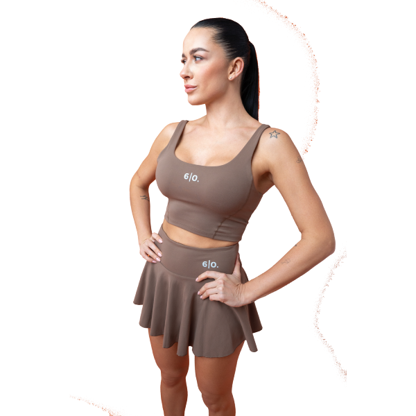 Šiame rinkinyje dera moteriška liemenėlė ir padelio teniso sijonas.