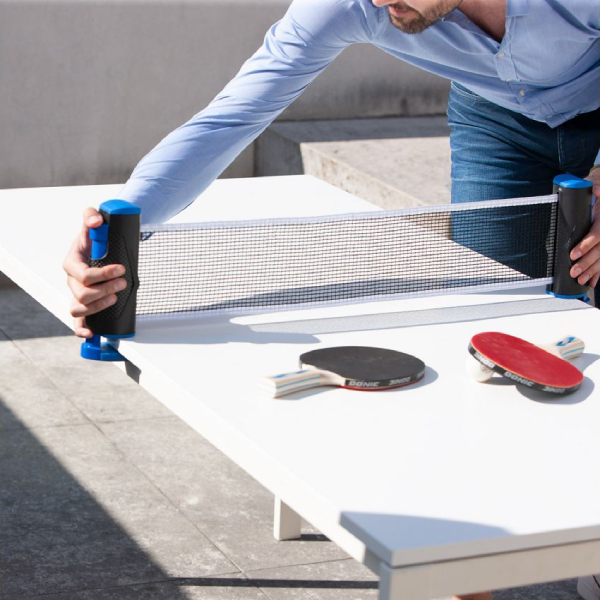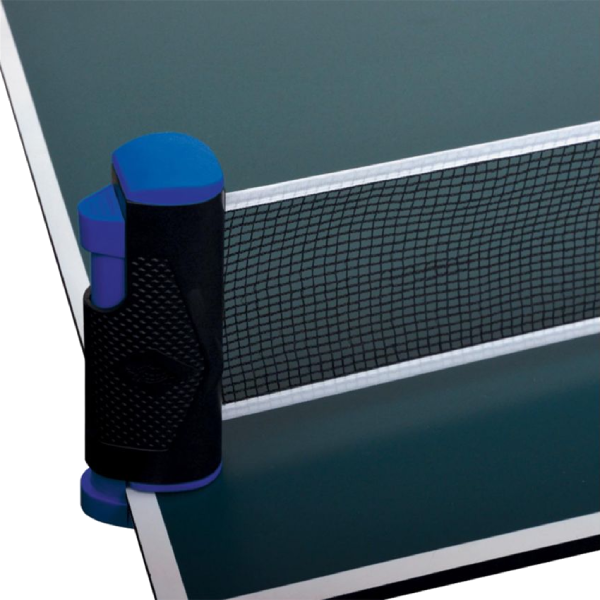 Specialus suvyniojimo ir išvyniojimo mechanizmas su stipria spyruokle, integruotas į du plastikinius stulpelius, leidžia naudoti šį tinkleįli prie kiekvieno stalo, kurio maksimalus plotis yra 175 cm.
