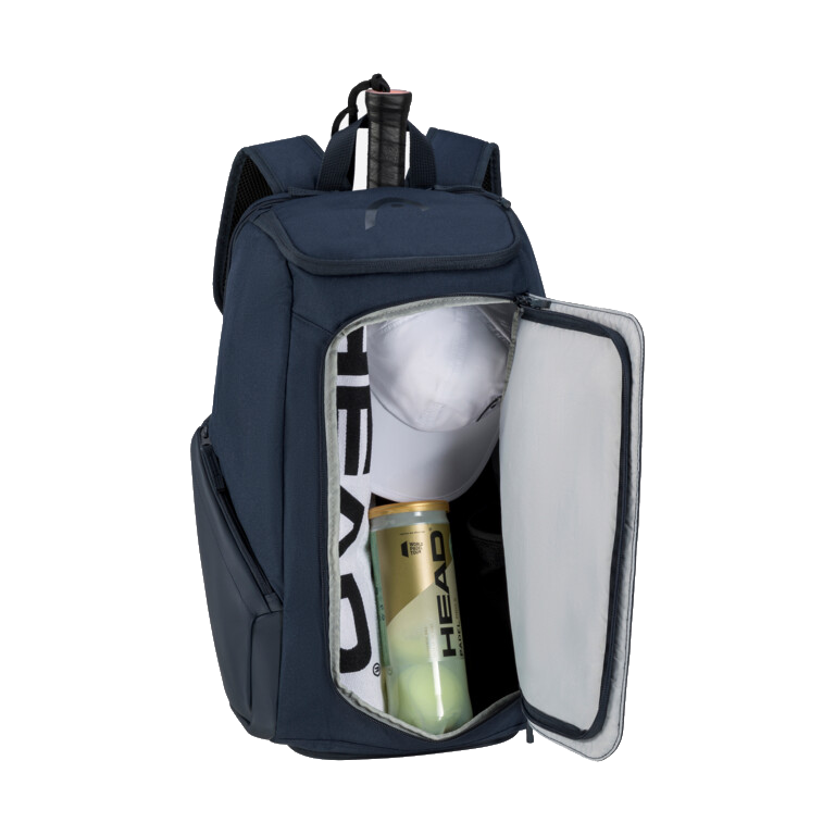 Šiuolaikinės kvadratinės formos PRO BACKPACK 28L NV modernus funkcionalumas susimaišo su gaiviu miestietišku stiliumi, kuris turi naują tamsiai mėlyną dizainą, atitinkantį naująją RADICAL padel rakečių seriją ir kitas HEAD raketes.